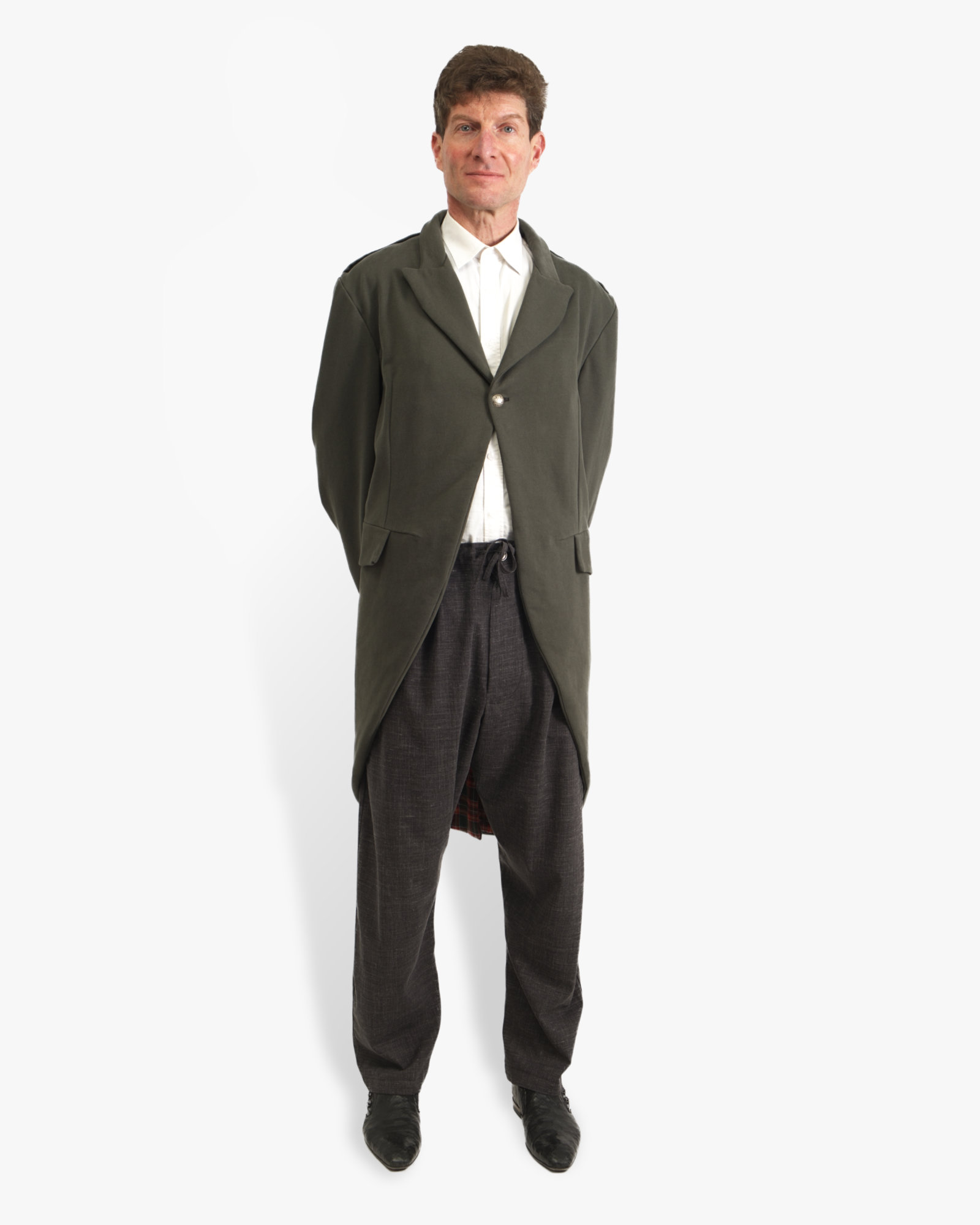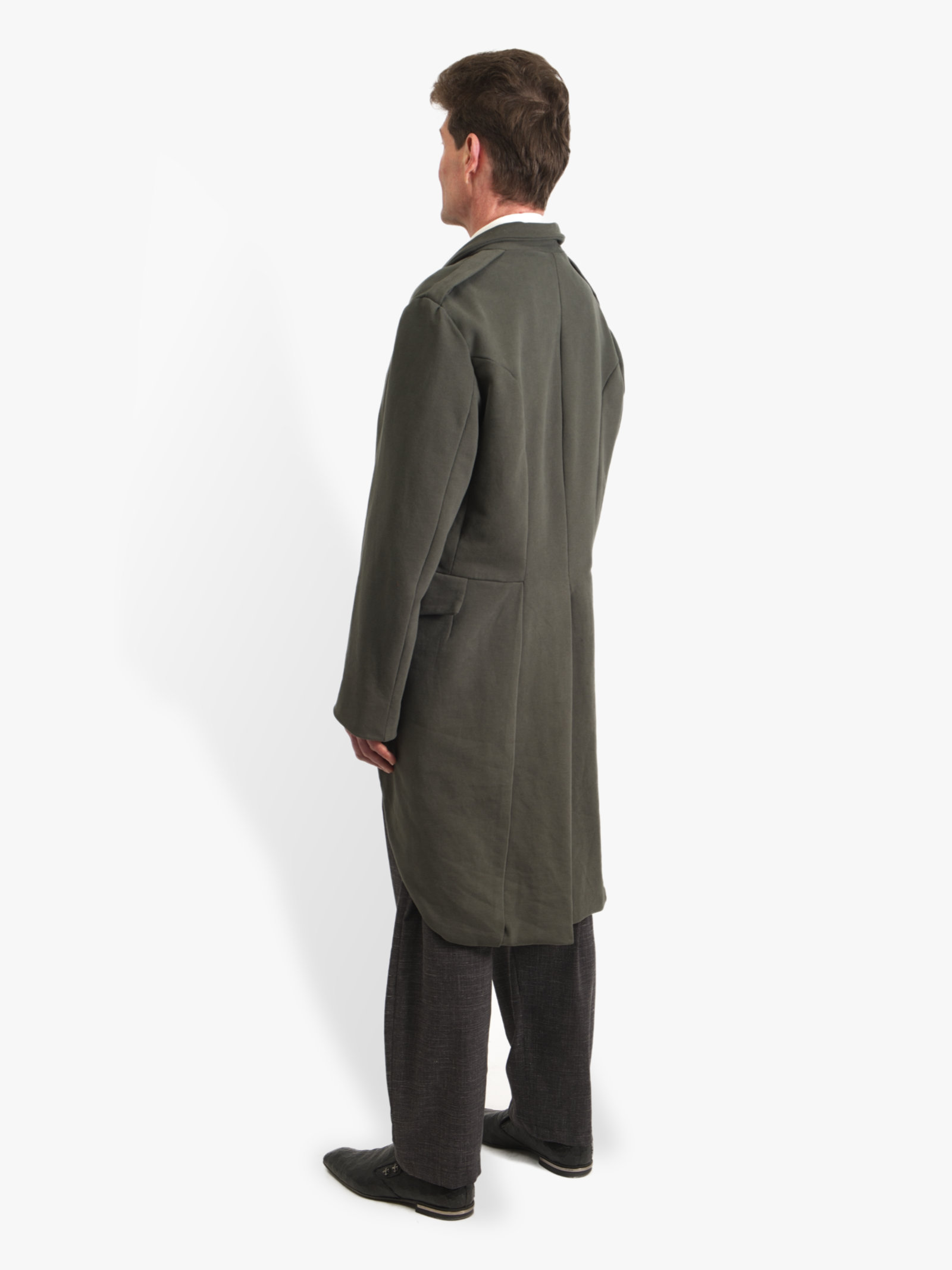 A ceremonial tailcoat reimagined in soft fleece. Genderless avant-garde tailoring inspired by Vivienne Westwood, handmade in Turin from deadstock organic cotton. Slim tailored cut with elongated lapels subverts heritage formality with everyday comfort. Bold statement piece for all genders.